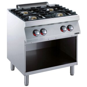 Standgerät mit 4 x 5,5 kW Flower-Flame Hochleistungsgasbrennern, Unterbau mit offenen Schrankraum. Maße außen: BTH 800 x 700 x 850mm, Anschlusswert Erdgas H: 22 kW, mit Pilotflammen. Kochzonendurchmesser: 60 mm